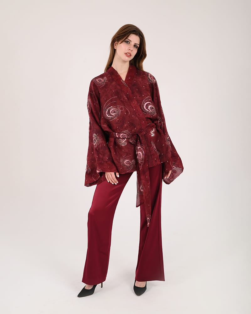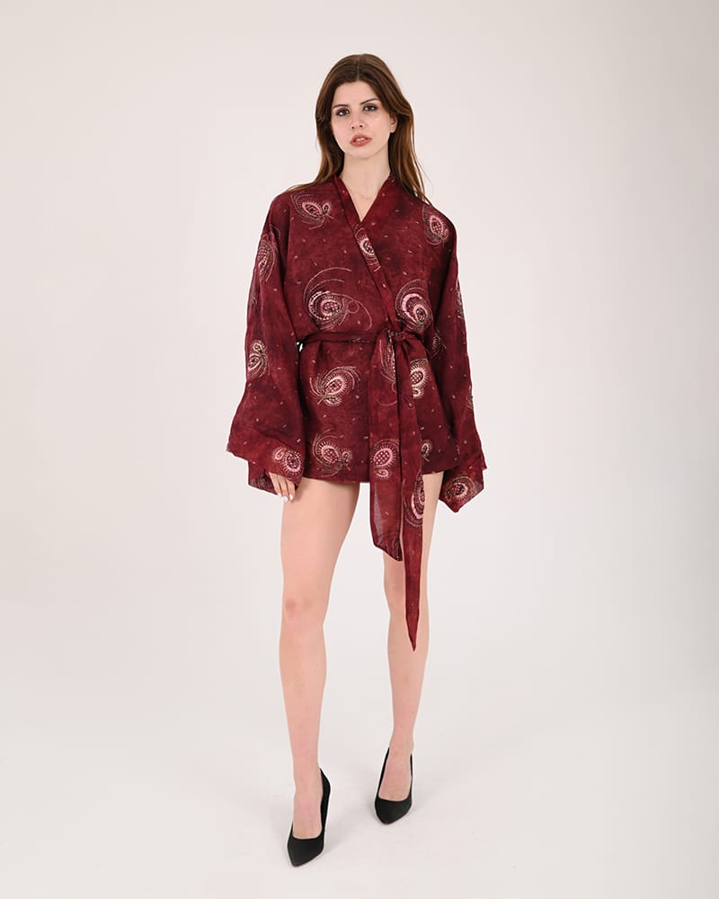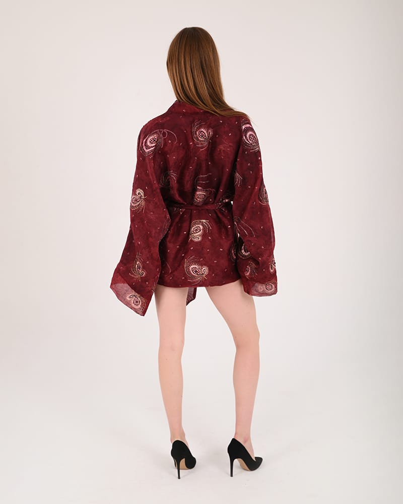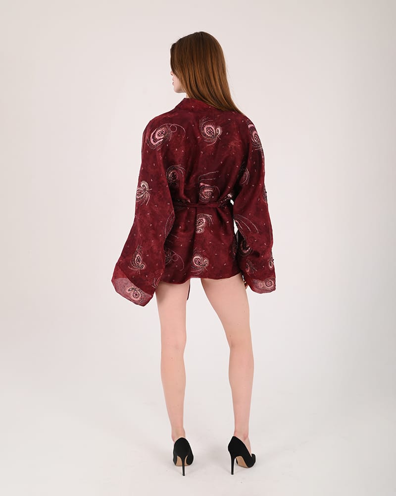 Handmade from a deep maroon textile, this kimono features paisley patterns in pink, beige, and subtle touches of gold. The piece is cut in a long silhouette with wide sleeves and an open, relaxed shape.