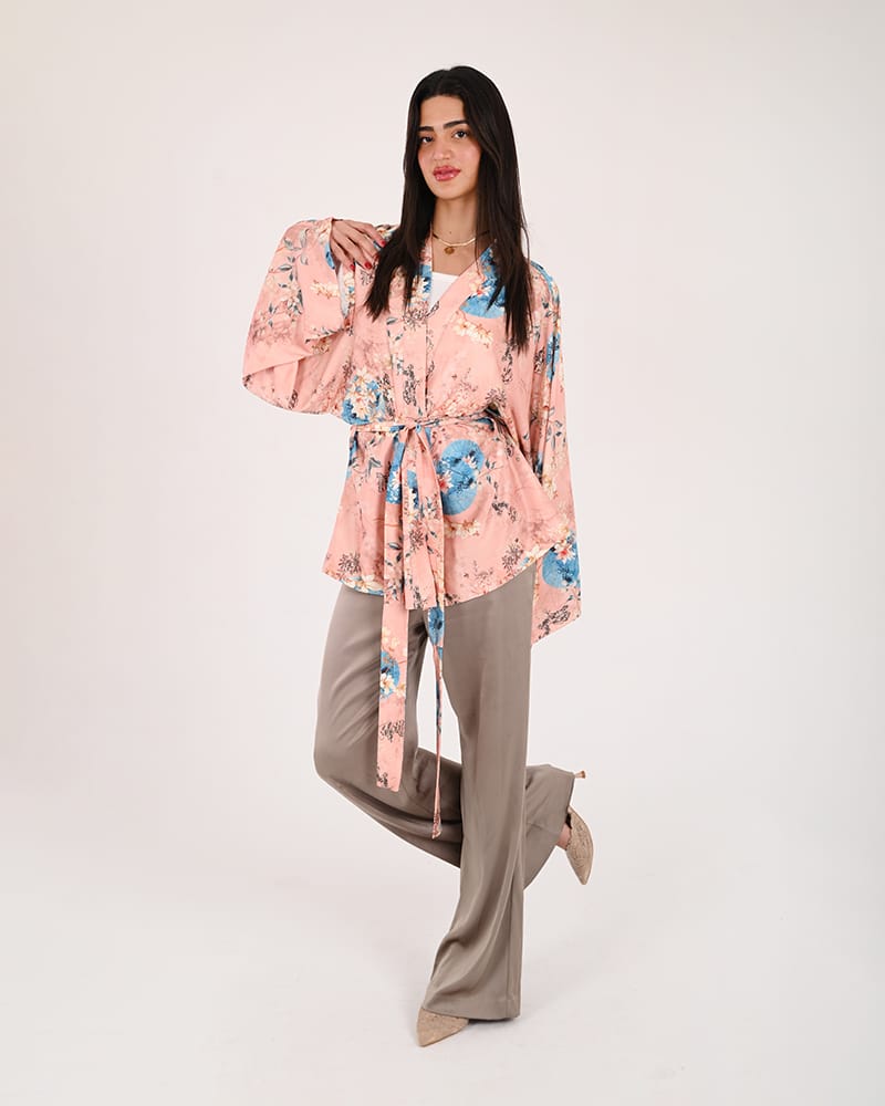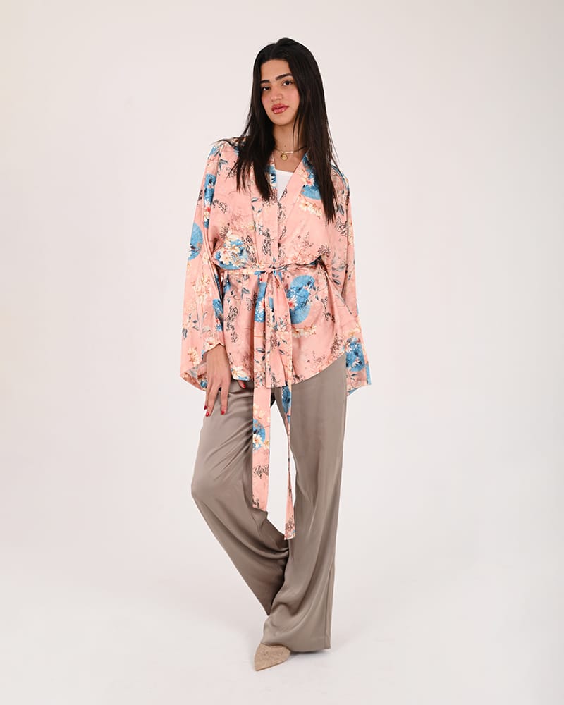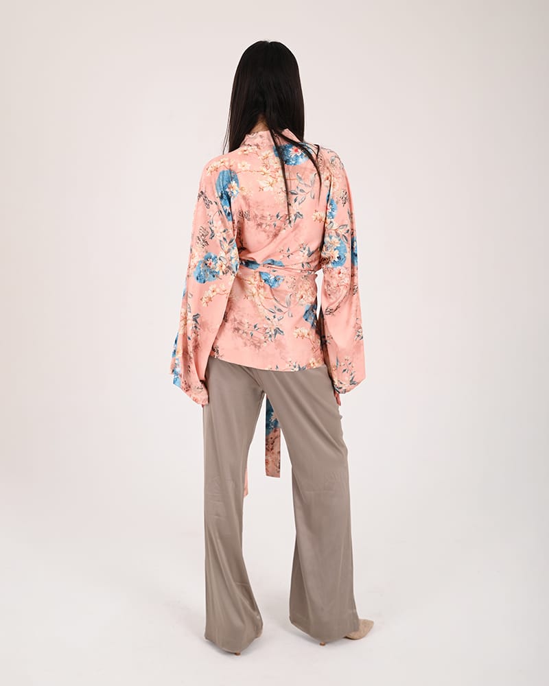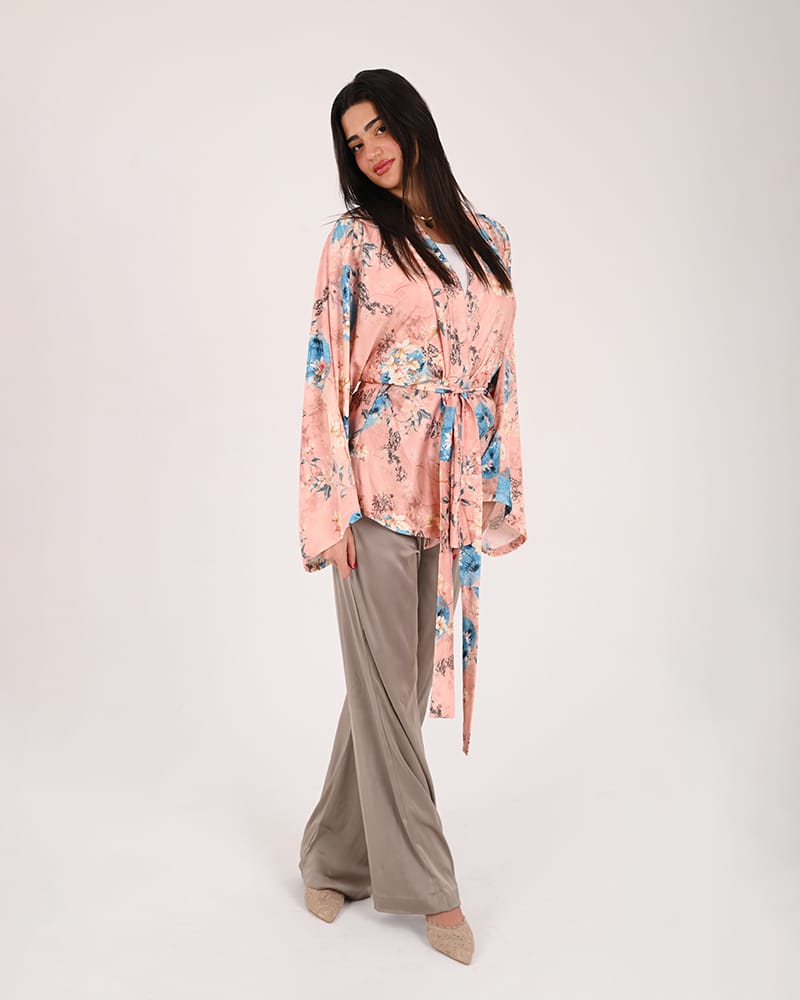 The piece is cut from a blush-pink textile base, enriched with blue and white floral motifs that bloom across the surface like painted fragments. Crafted from a soft, silky fabric, it is designed to make you feel elegant and effortlessly put together — a garment that drapes with fluidity while holding its form with quiet strength. Each panel is placed with intention, creating a rhythm of contrast between delicate florals and smooth expanses of color.